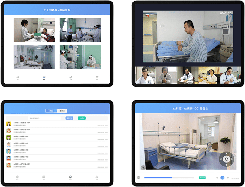 智能监控交互系统可以进行多人视频连线,对患者进行远程诊断、远程会诊、直播录制、远程探视等, 医护及患者终端及各分区终端定制软件支持查看视频、控制摄像头和回看、支持呼叫、音频处理等功能。